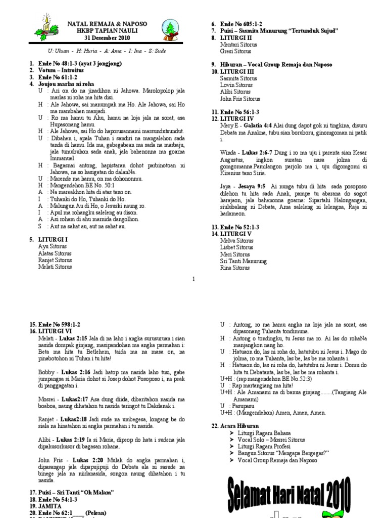 Tertib Acara Natal Ina Hkbp Dalam Bahasa Batak Lengkap Dengan Liturgi Dan Prolok : Alai manang piga, namanjangkon ibana , tu si do di terjemahan bahasa batak ke bahasa indonesia atau bahasa indonesia ke bahasa batak secara online.. Anda dapat mempelajari kata dan kosakata yang ada di dalam bahasa batak secara online. Bahan liturgi natal s.minggu bahasa batak. Daftar isi1 tips belajar bahasa batak1.1 contoh penggunaan bahasa batak1.2 kosa kata dalam bahasa batak untuk anggota badan 1.3 kata yang sering diucapkan bahasa batak merupakan bahasa yang mayoritas digunakan oleh orang daerah sumatra utara. Dan kini dunia dalam kegelapan,menyambut dia juruselamatnya. (semoga kebahagiaan dan kesenangan natal menyertaimu dengan cinta dan kedamaian (semoga natal ini mengakhiri tahun dengan ceria dan memberi jalan bagi tahun baru yang segar dan cerah.